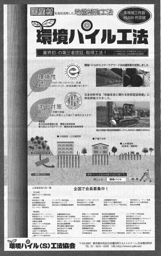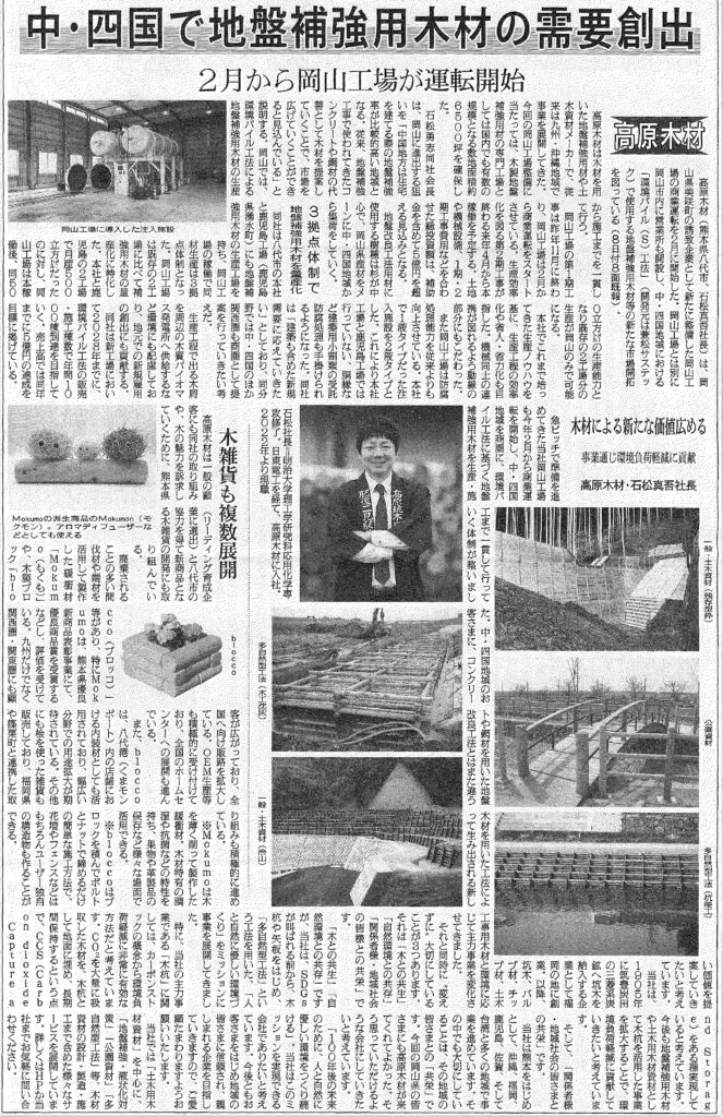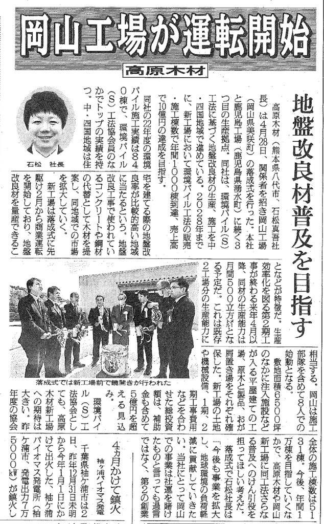 2023.06 09 【Fri】 お知らせ 新聞に弊社が掲載されました‼ この度、日刊木材新聞にて高原木材を掲載していただきました。 当社が取り組んでいる、国産材を有効活用した地盤補強工法【環境パイル工法】が紹介されました。 また、4月28日に行われた岡山工場の落成式の様子や今後の意気込みなども掲載されております。 本記事は2023年5月9日発行の、日刊木材新聞の紙面でもご覧いただけます。 記事の内容で、気になる点などございましたらお気軽に御問合わせください。 この記事をシェアする