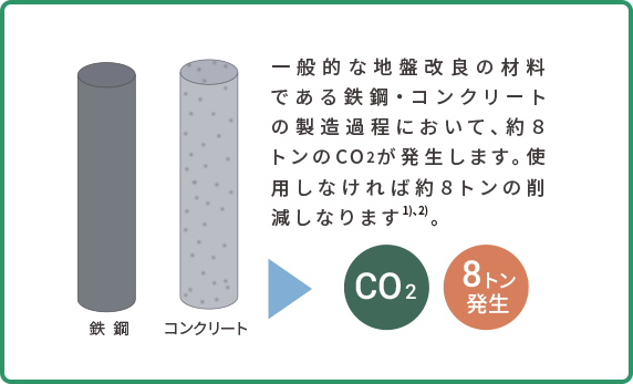 そしてセメントや鉄を用いた地盤改良を環境パイルに置換する事で1棟あたりの二酸化炭素を約10t削減できます。