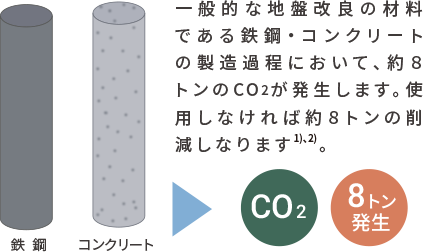 一般的な地盤改良の材料である鉄鋼・コンクリートの製造過程において、1棟あたり約8トンのCO2が発生します。