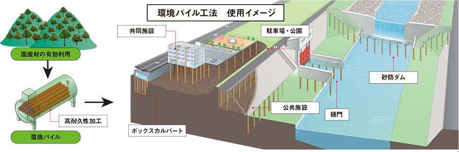 加圧注入保存処理することで腐朽や白蟻を防ぐことができ、長い年数を経てもその品質は持続します。エコと耐久性を併せ持つ地盤改良を実現しています。