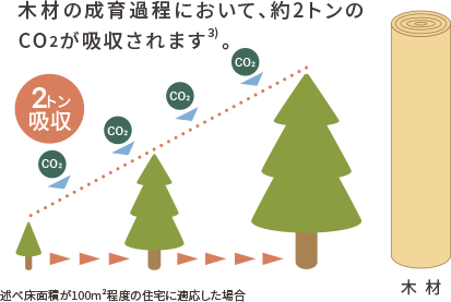 国産の木材を使用した環境パイル工法は、木材の成育過程にておいて、1棟あたり約2トンのCO2を吸収します。