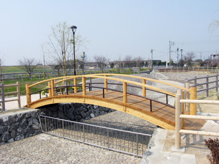 福岡県朝倉市にある三連水車にある公園の橋やベンチなどを納品させていただきました。